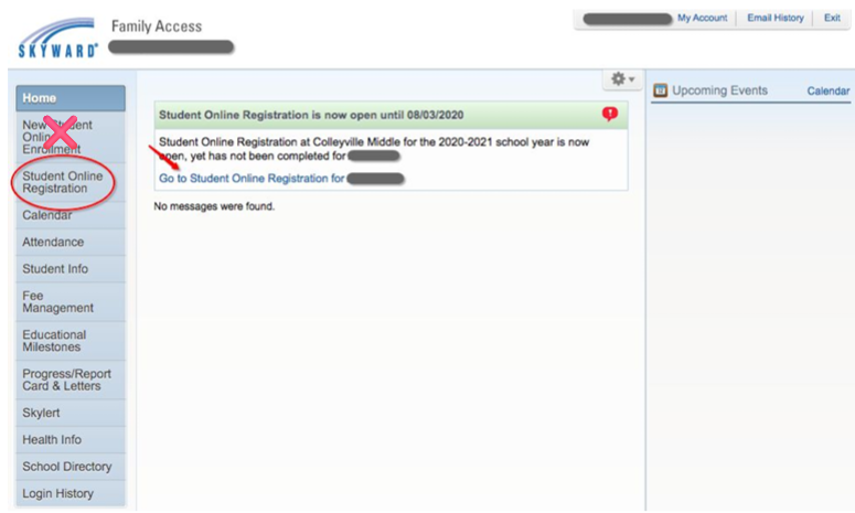 - Click the tab on the left that says "Student Online Registration" or click directly to your student’s name in the alert box on the right. Do not use the NEW student Online Enrollment button at the top.